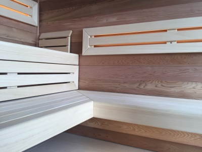 Luxusní finská sauna provedená ze širokého cedru s nerezovým finským topidlem HELO Rocher sovládanou digitální regulací T1. Obklad z cedru je až do stropu. Interiér je proveden na míru dle návrhu architekta z Abachi. Z lavice přes prosklení je nádherný výhled z rezidenčního vinohradského bytu na Prahu.