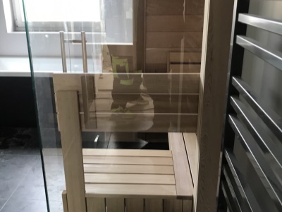 Finská sauna z ušlechtilého cedru s proskelním všech stěn vestavěná do koupelny v podkrovním bytě.Hvězdné nebe na stropě sauny vytváří dokonalou atmosféru .